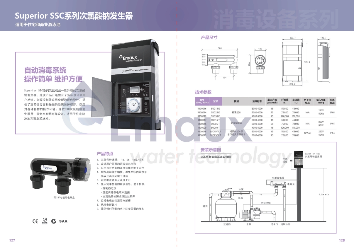 競技池Superior SSC系列次鹽機(jī)是一款升級的次氯酸鈉發(fā)生器這次產(chǎn)品升級整合了多年設(shè)計(jì)和用戶反饋。電源控制器采用全新的現(xiàn)代設(shè)計(jì),提供了更簡便界面和先進(jìn)的系統(tǒng)保護(hù)程序,以應(yīng)對各種各樣的操作環(huán)境。這款SSC次氯酸鈉發(fā)生器是一款經(jīng)久耐用可靠設(shè)備,適用于住宅游泳池和商業(yè)游泳池。