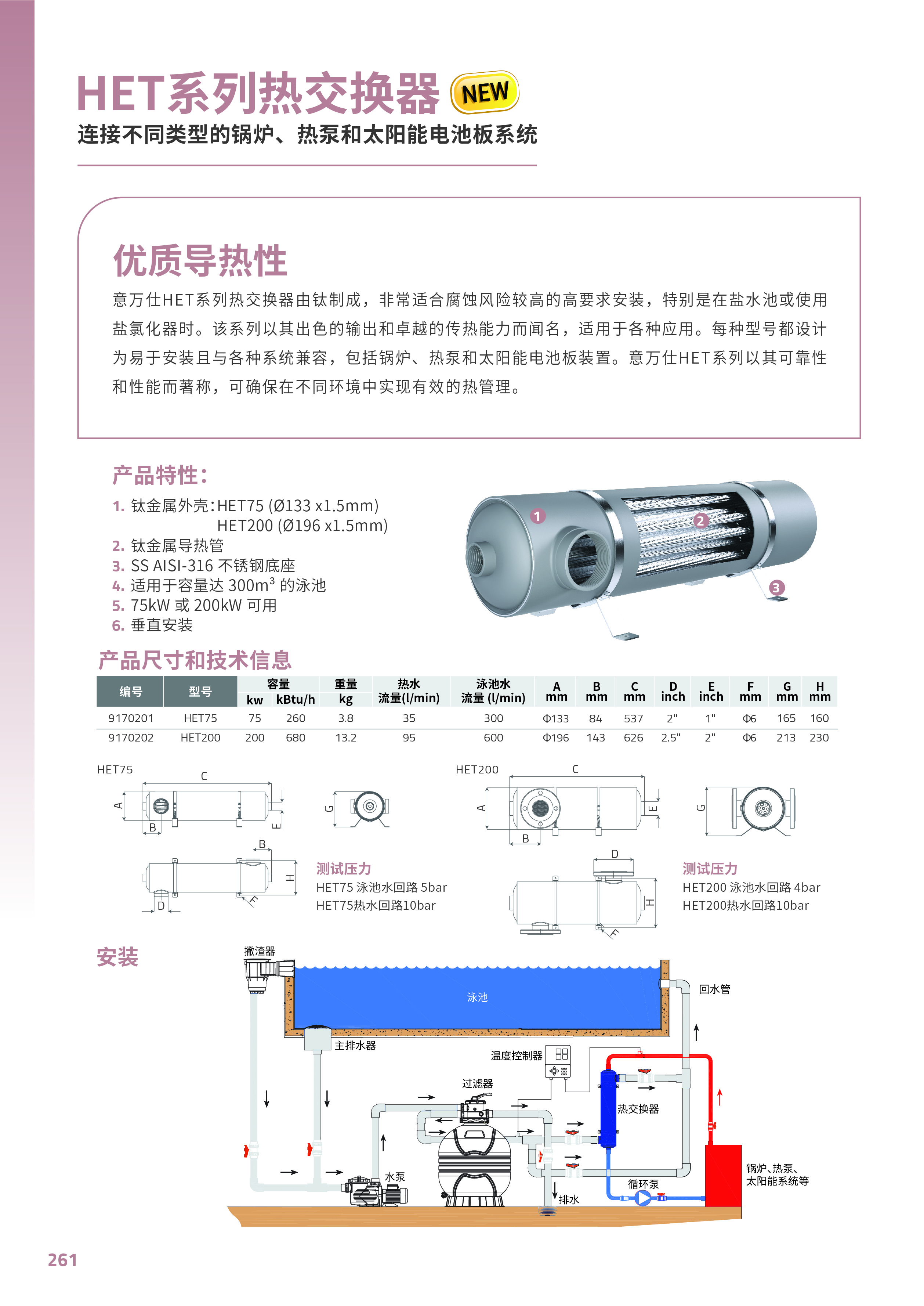 意萬仕HET系列熱交換器由鈦制成,?常適合腐蝕風險較?的?要求安裝,特別是在鹽水池或使用 鹽氯化器時。該系列以其出色的輸出和卓越的傳熱能力而聞名,適用于各種應(yīng)用。每種型號都設(shè)計 為易于安裝且與各種系統(tǒng)兼容,包括鍋爐、熱泵和太陽能電池板裝置。意萬仕HET系列以其可靠性 和性能而著稱,可確保在不同環(huán)境中實現(xiàn)有效的熱管理。