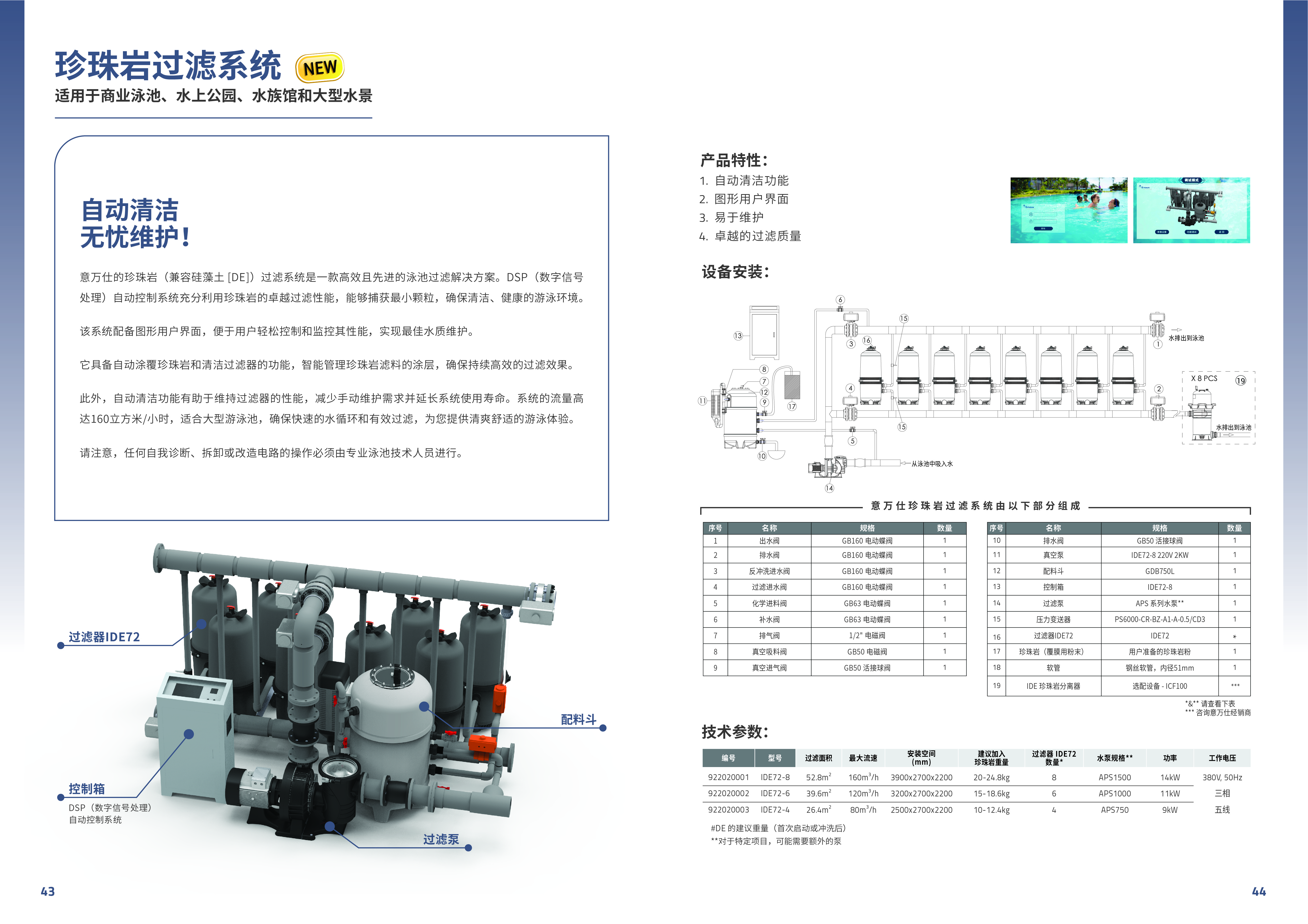 競(jìng)技池意萬仕的珍珠巖(兼容硅藻土 [DE])過濾系統(tǒng)是一款高效且先進(jìn)的泳池過濾解決方案。DSP(數(shù)字信號(hào) 處理)自動(dòng)控制系統(tǒng)充分利用珍珠巖的卓越過濾性能,能夠捕獲最小顆粒,確保清潔、健康的游泳環(huán)境。 該系統(tǒng)配備圖形用戶界面,便于用戶輕松控制和監(jiān)控其性能,實(shí)現(xiàn)最佳水質(zhì)維護(hù)。 它具備自動(dòng)涂覆珍珠巖和清潔過濾器的功能,智能管理珍珠巖濾料的涂層,確保持續(xù)高效的過濾效果。 此外,自動(dòng)清潔功能有助于維持過濾器的性能,減少手動(dòng)維護(hù)需求并延長系統(tǒng)使用壽命。系統(tǒng)的流量高 達(dá)160立方米/小時(shí),適合大型游泳池,確保快速的水循環(huán)和有效過濾,為您提供清爽舒適的游泳體驗(yàn)。 請(qǐng)注意,任何自我診斷、拆卸或改造電路的操作必須由專業(yè)泳池技術(shù)人員進(jìn)行。
