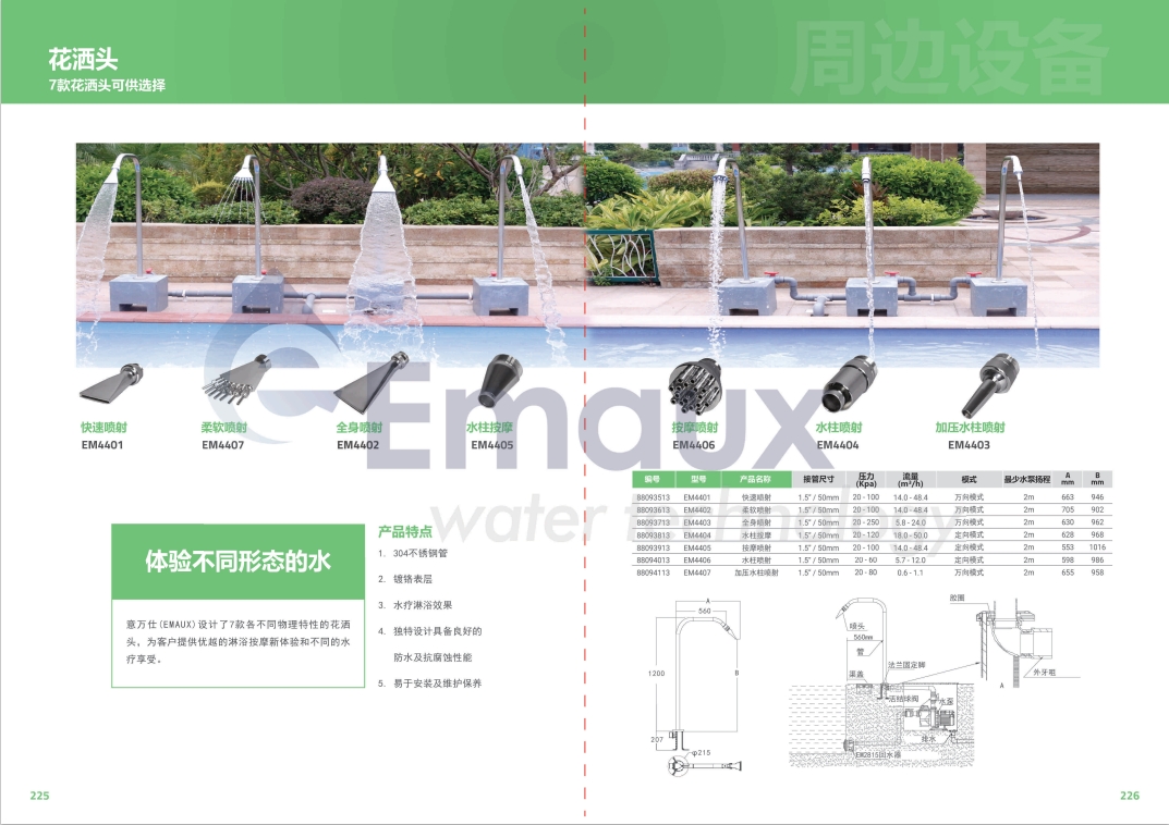 競(jìng)技池意萬(wàn)仕(EMAUX)設(shè)計(jì)了7款各不同物理特性的花灑頭,為客戶提供優(yōu)越的淋浴按摩新體驗(yàn)和不同的水療享受。
